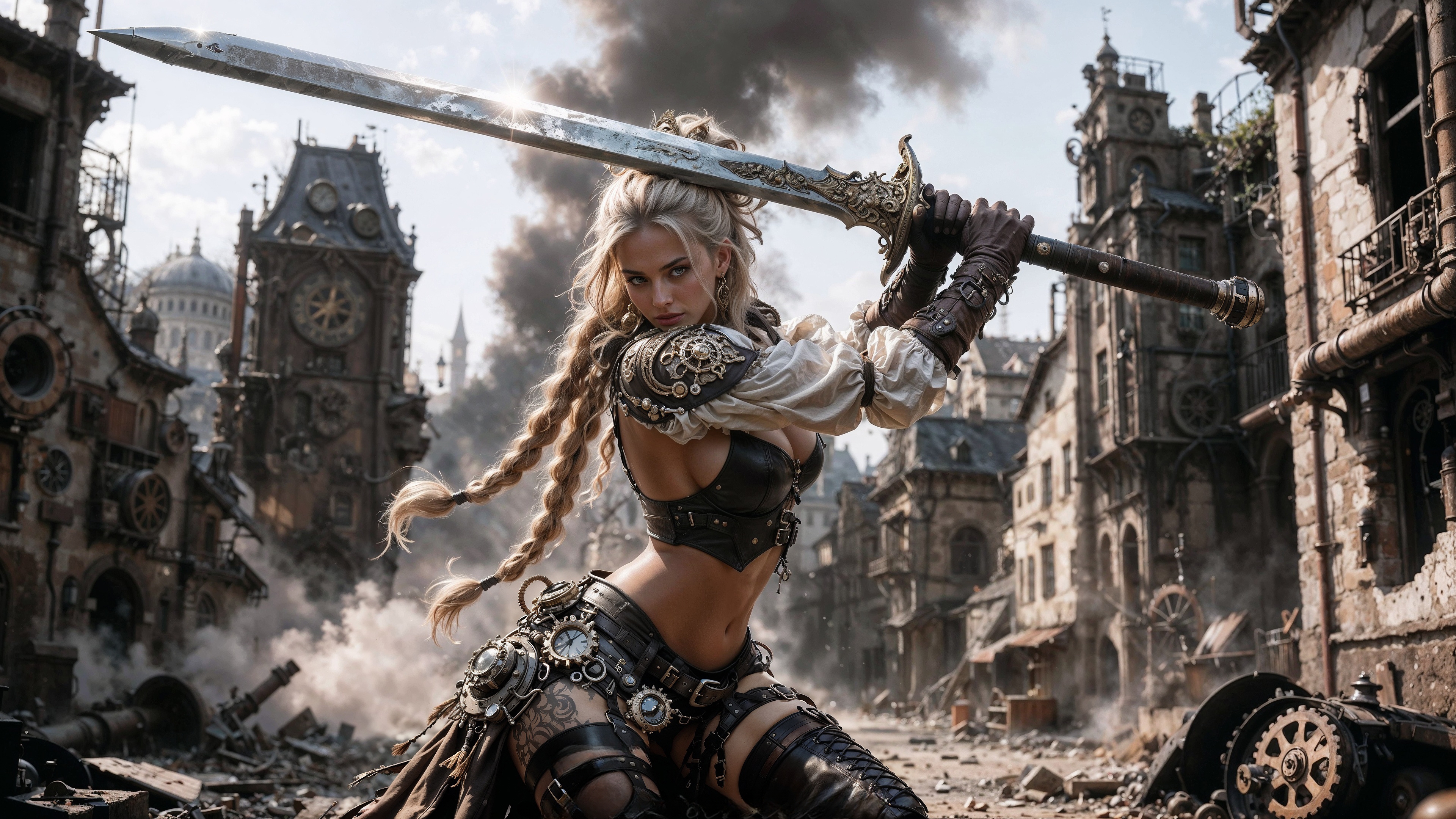 Блондинка в костюме в стиле стимпанка с длинными косами позирует с большим мечом, поднятым над головой 00 В закладки Скачать Хорошие качество Маленкое качество 18-10-25 29 Теги: 3840x2160, 4к, full hd, hd, город, девушки, люди, небо, нейросеть, облака, оружие, широкоформатные Комментарии (0) Написать Прокомментировать Введите код с картинки: Отправить Похожее видео: 3-10-25 Девушка с рыжими волосами в темном костюме смотрит вверх, на фоне футуристического города в стиле киберпанк с яркими неоновыми огнями 16-09-25 Брюнетка с косами в кожаной черной юбке и сапогах, в золотой блузке с чокером лежит на кровати в комнате 24-09-25 Блондинка в белом топе позирует, сидя за деревянным столом с монетами, кошельком и стаканом кофе, на фоне ряда синих стиральных машин в прачечной 24-09-25 Симпатичная стройная длинноволосая блондинка в белом платье позирует, стоя на фоне деревьев и осенней листвы 13-10-25 Мужчина в желто-сером тактическом костюме из игры Apex Legends держит пистолет, опираясь на руку головой, на светлом бежевом фоне 16-09-25 Девушка Lofi girl в наушниках сидит на деревянной веранде в стиле Релакс / Relax, рядом спит кот, на фоне зеленого парка с прудом 16-09-25 Темно-серый седан BMW E90 стоит на асфальте, перед большим старым военным вертолетом, на фоне здания и ярко освещенного закатным солнцем 16-09-25 Блондинка с косой в черном платье, белых перчатках и шляпе сидит на кожаном диване