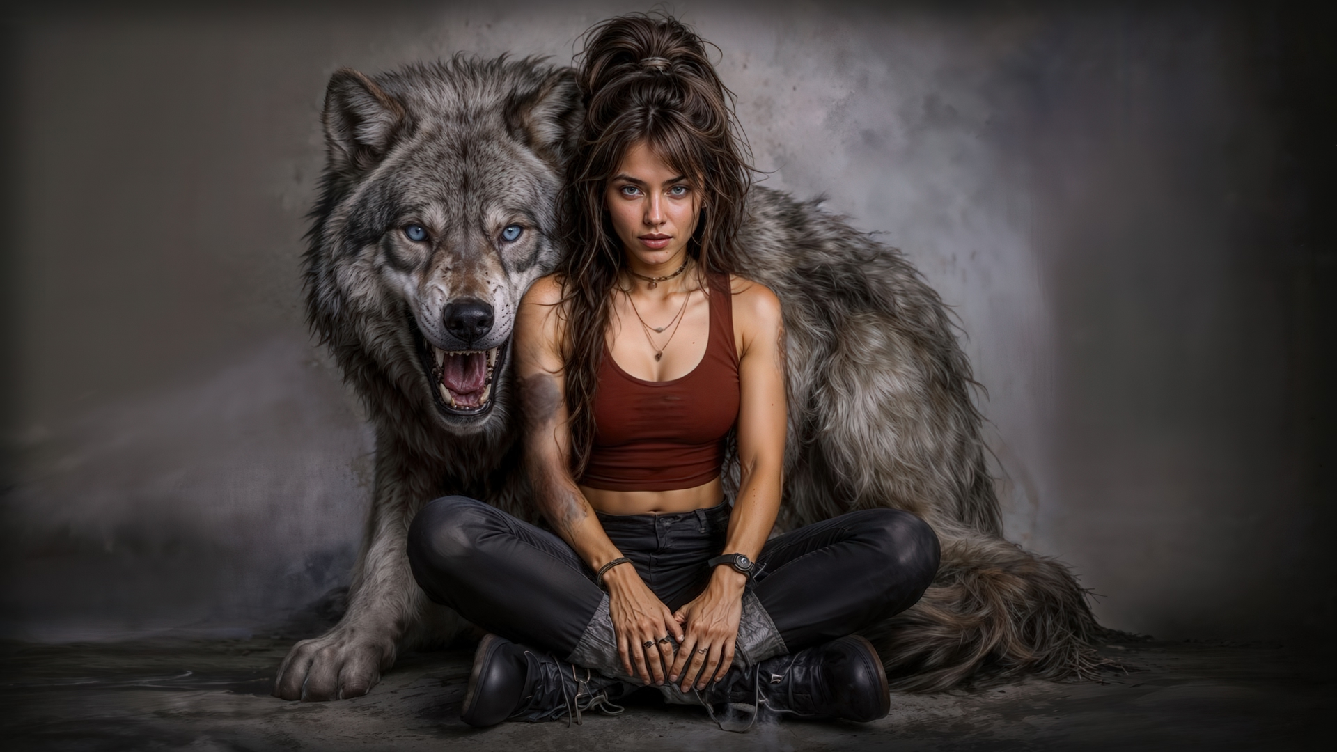 Девушка в красно-коричневом топе и темных брюках на полу, рядом с ней большой серый волк с открытой пастью и голубыми глазами, на темном дымчатом фоне 00 В закладки Скачать Хорошие качество Маленкое качество 4-11-25 12 Теги: 1920x1080, full hd, hd, волки, девушки, животные, люди, нейросеть, студия, широкоформатные Комментарии (0) Написать Прокомментировать Введите код с картинки: Отправить Похожее видео: 16-09-25 Молодая девушка с мечом, излучающим синий свет, атакует кибернетического монстра с открытой пастью на фоне разрушенного города 6-10-25 Волк с горящими глазами в накидке среди отары овец 13-10-25 Черный кот с ярко-голубыми глазами и синими прядями меха, одетый в темный капюшон и костюм с ремнями, смотрит прямо, на темном фоне 16-09-25 Светловолосая девушка в коричневом топе и в юбке сидит в пятне света на темном фоне 3-10-25 Кошко-девушка с голубыми глазами в плаще в средневековом городе днем 6-10-25 Девушка с короткими белыми волосами и светящимися голубыми глазами позирует, повернув голову через плечо, с катаной за спиной 3-10-25 Молодая девушка в желтом платье позирует в плетеном кресле, рядом с ней на столе белая чашка, на фоне тропической зелени и деревьев 3-10-25 Девушка в белом спортивном костюме и красном козырьке сидит на теннисном корте, поправляя носок, рядом с ней две ракетки и два теннисных мяча